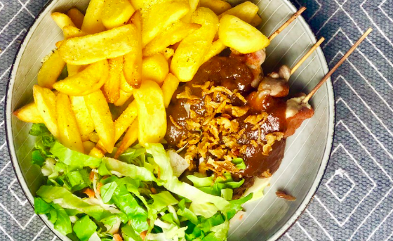 Kipsate met satesaus en gebakken uitjes geserveerd met frites en salade