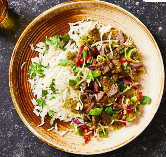 Gewokte biefstukpunten met ketjapsaus en groenten op basmati rijst