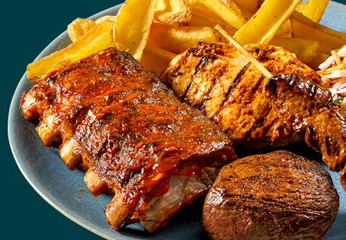 Mixed grill van biefstuk, kipfilet en spareribs met pepersaus, frites en rauwkost