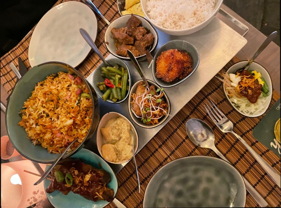 Vervolgens worden verschillende rijsttafelgerechten aan tafel geserveerd: vlees, vis, groenten en bijgerechten in rijke smaken en huisgemaakte sauzen.